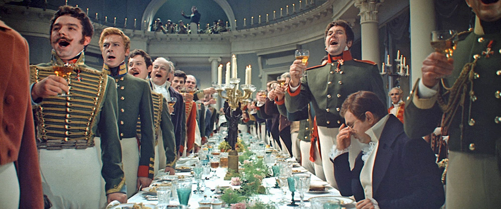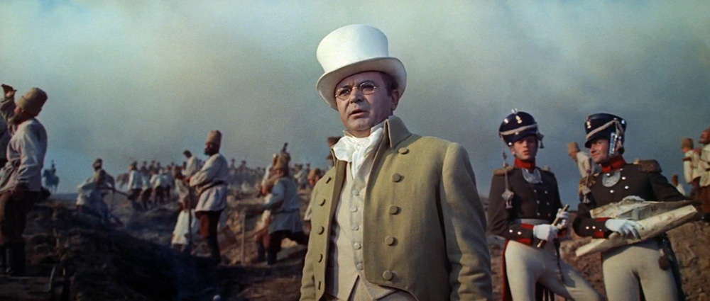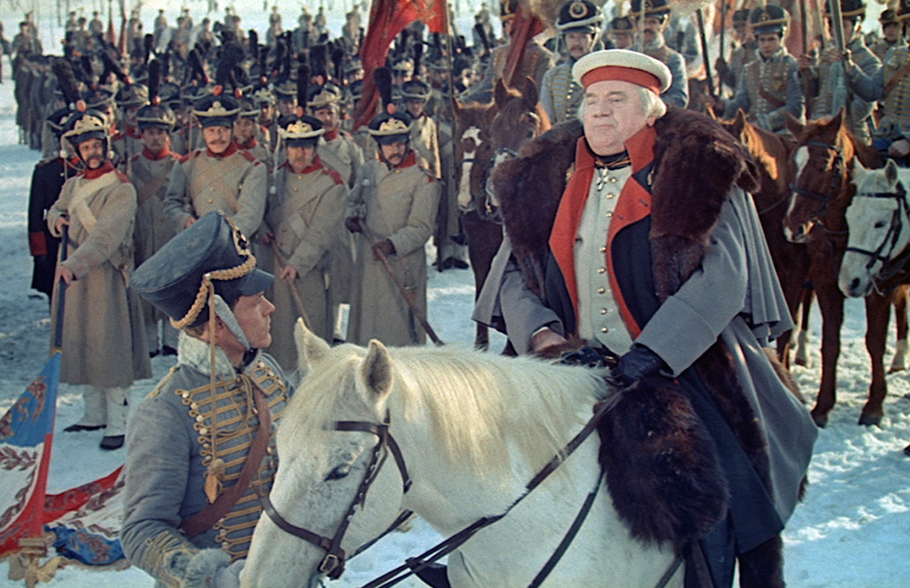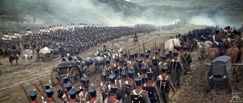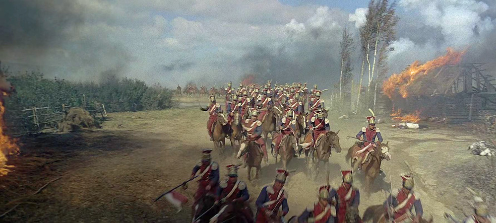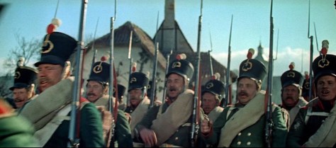 Für mich ist die schönste Szene des Films der Einmarsch der russischen Truppen nach Österreich im Jahr 1805, kurz vor der Schlacht bei Austerlitz. Die russische Armee ist noch siegesgewiss, und die Landbevölkerung befindet sich in ausgelassener Stimmung.